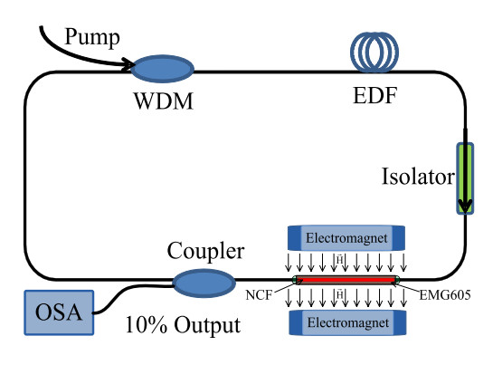 如下圖所示是用于磁場(chǎng)檢測(cè)的基于磁流體的光纖環(huán)形激光傳感器,在激光環(huán)型腔中接入涂覆有磁流體的單模-無(wú)芯-單模光纖結(jié)構(gòu),可以同時(shí)作為帶通濾波器和磁場(chǎng)傳感元件?;谧杂诚裥?yīng),外界磁場(chǎng)改變時(shí)會(huì)通過(guò)作用于磁流體從而改變單模-無(wú)芯-單模光纖結(jié)構(gòu)的濾波參數(shù)即輸出光譜波長(zhǎng),得到的帶通濾波邊模抑制比為14 dB,插入損耗約為-1.03 dB。當(dāng)外界磁場(chǎng)增大時(shí),激光波長(zhǎng)藍(lán)移。在15.9 Oe到222.3 Oe的磁場(chǎng)范圍內(nèi)傳感靈敏度為12.05 pm/Oe。該傳感器具有高信噪比的輸出光譜、窄帶寬和高Q值等優(yōu)點(diǎn)。